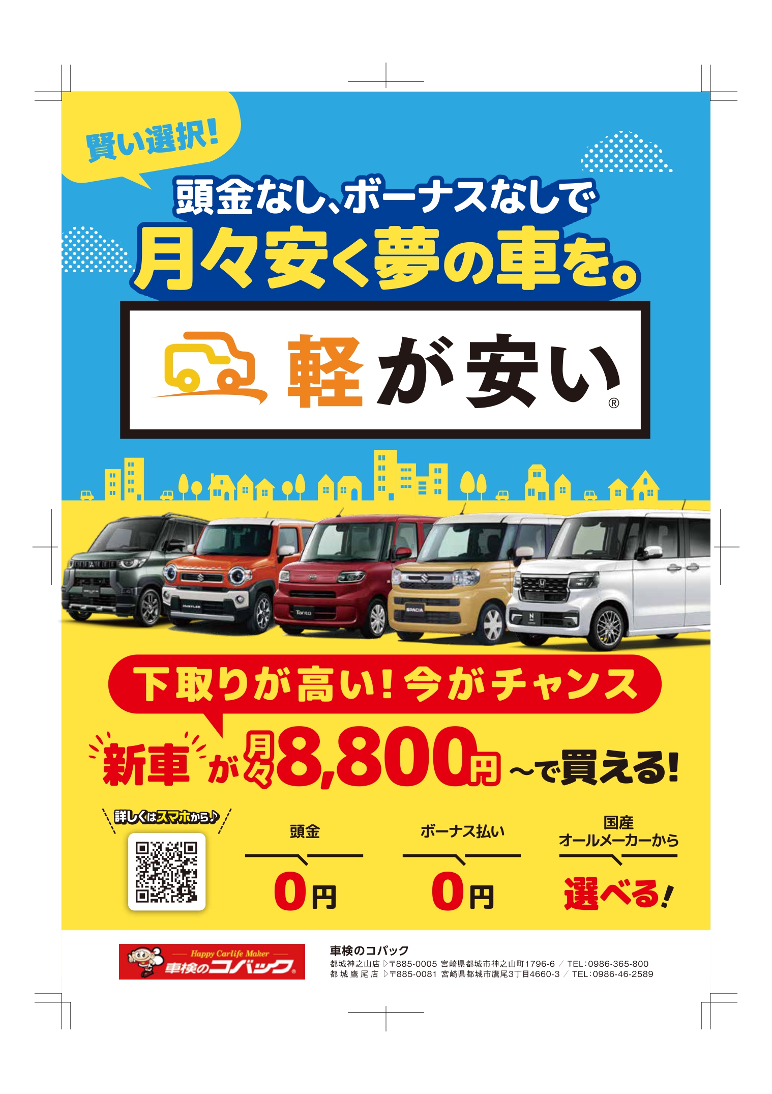 都城市の車検ならコバック都城神之山店・都城鷹尾店。[コバック都城神之山店]宮崎県都城市神之山町1796-6 [コバック都城鷹尾店]宮崎県都城市鷹尾3-4660-3。 【WEB受付】24H年中無休対応/代行料0円、見積り0円、代車0円【業界最安値】の店舗数全国NO.1車検専門店